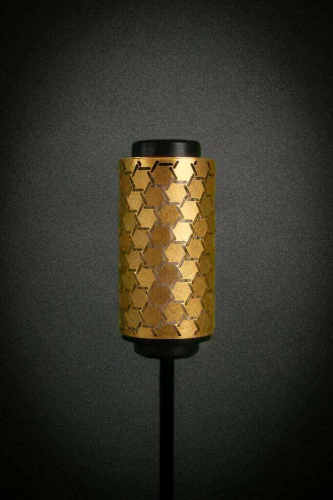 "メタルシェード"はヘキサラティスの六角形が、筒型にも関わらず独立して平面であることで、まるでプリズムのように美しく反射します。