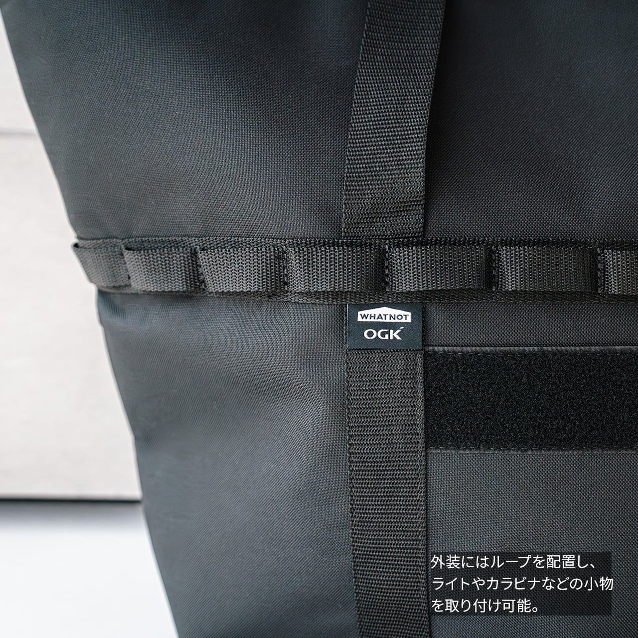 外装にはWHATNOTらしいループを配置しており、ライトやカラビナなどの小物を取り付けが可能。ベルクロスペースや、使い勝手の良い大きめポケットも備えています。