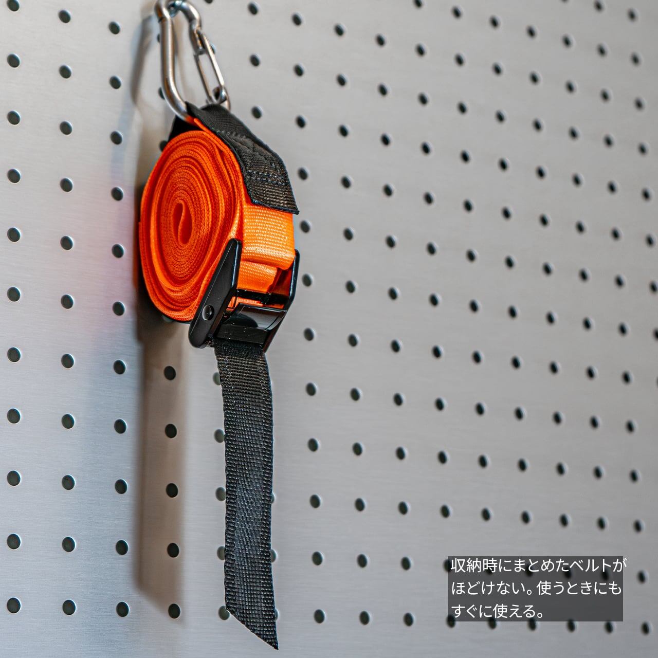 一般的な荷締めベルトと大きく異なるのは、収納時にくるくるとまとめたベルトがほどけないこと。