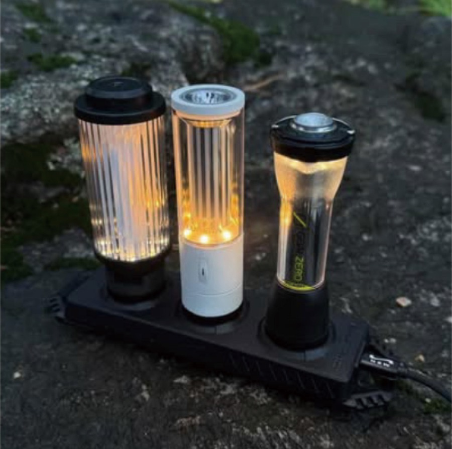 * USB‑PD(12 V/9 V入力)+内部安定5 V出力で、複数ライトの効率的な充電を実現。