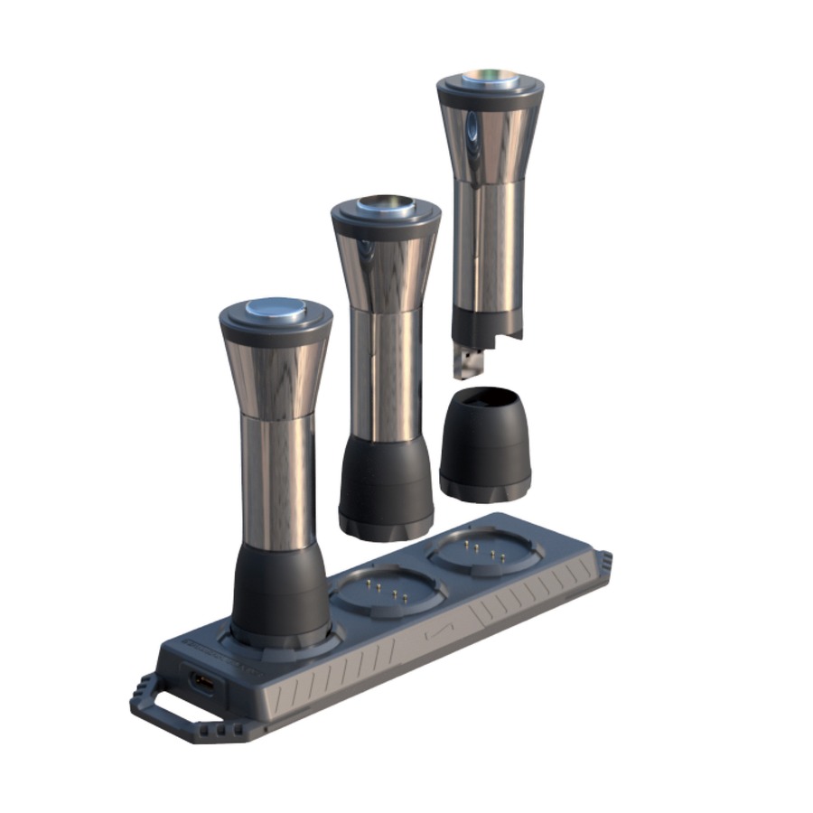 2. 充電ケーブルが接続されたステーション上に、レシーバー装着済ライトを置くと充電開始。USB‑PDまたはQuickCharge対応アダプターを必ずご使用ください。