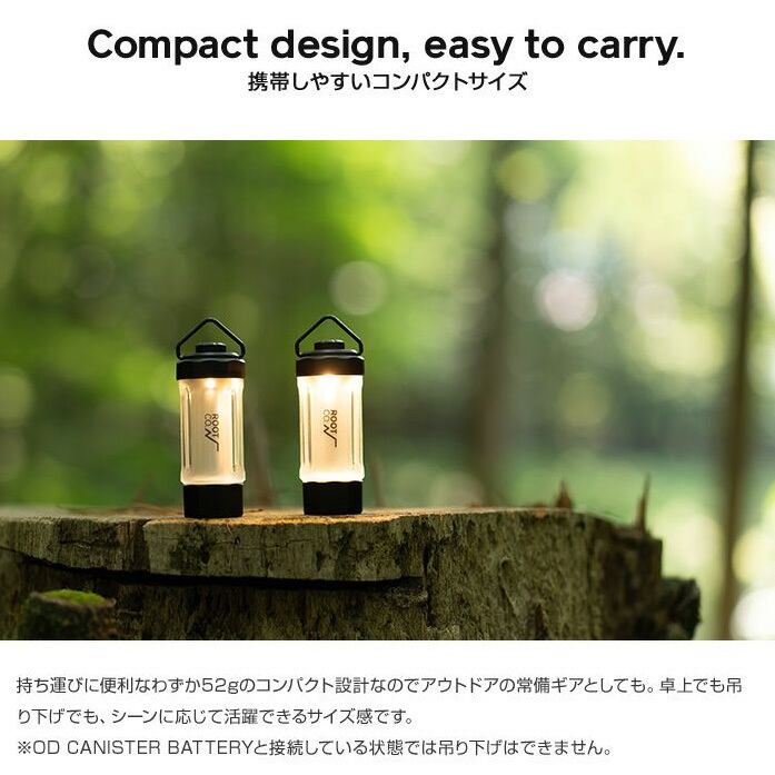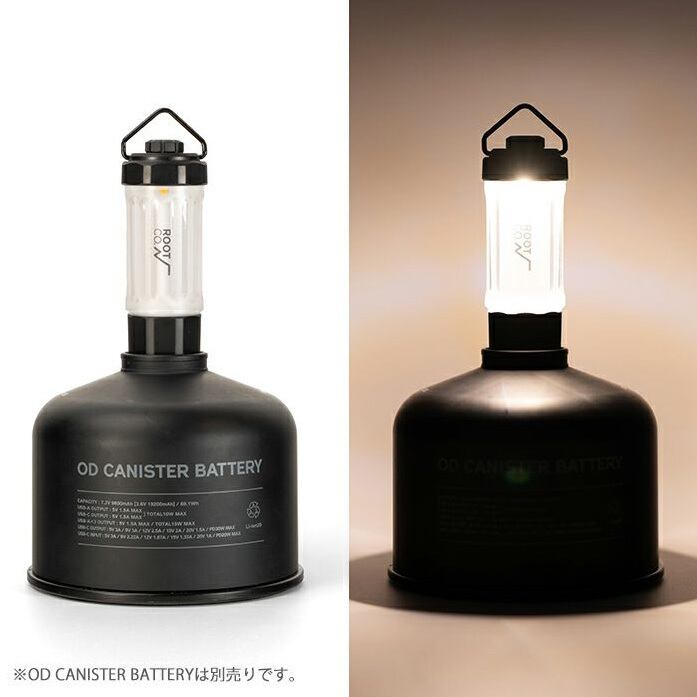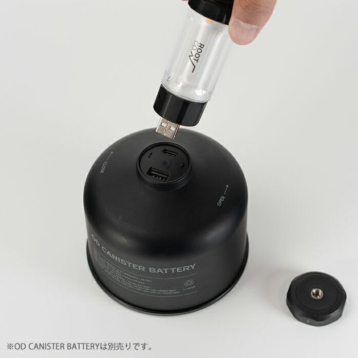 バッテリーを内蔵しているためランタン単体でも使用可能ですが、「OD CANISTER BATTERY」(別売)と組み合わせることでより実用的に。本ランタンのUSB-A充電コネクタを「OD CANISTER BATTERY」の天面USB-Aポートに挿し込むことで、“給電”と“スタンド機能”を一体化したスマートな使用が可能となります。