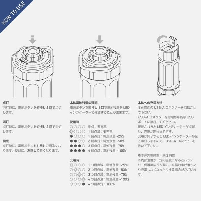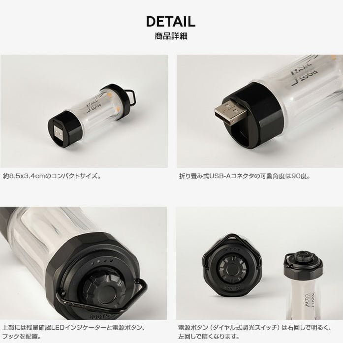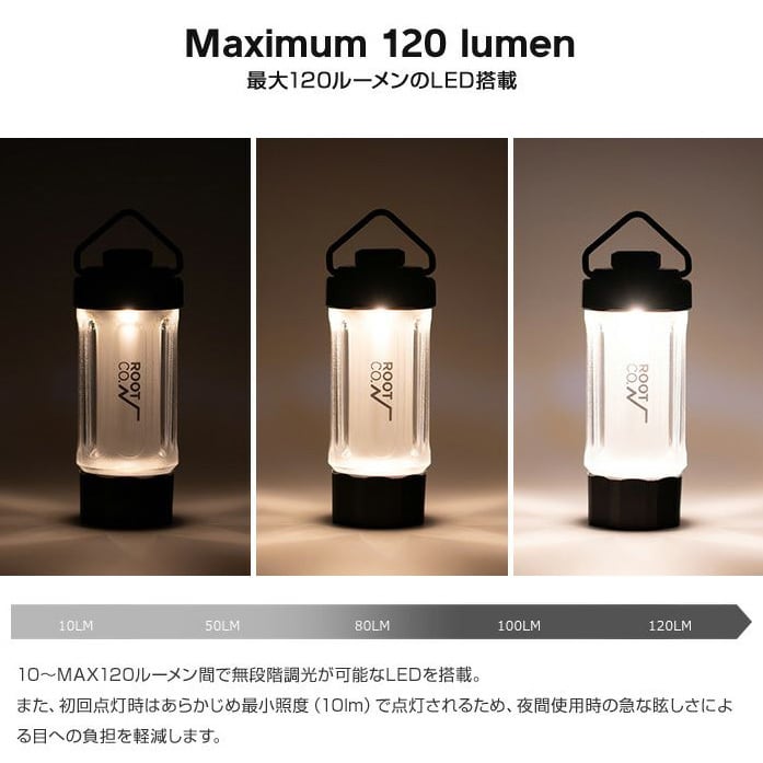 また、持ち運びやすいミニマムなサイズ感ながらも最大120ルーメン&使いやすいダイヤル式無段階調光機能を搭載し、キャンプ等で快適に使える機能をプラスしました。