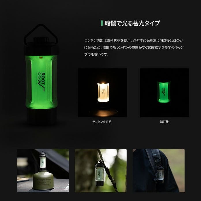 ランタン内部に蓄光素材を使用。点灯中に光を蓄え消灯後はほのかに光るため、暗闇でもランタンの位置がすぐに確認でき夜間のキャンプでも安心です。