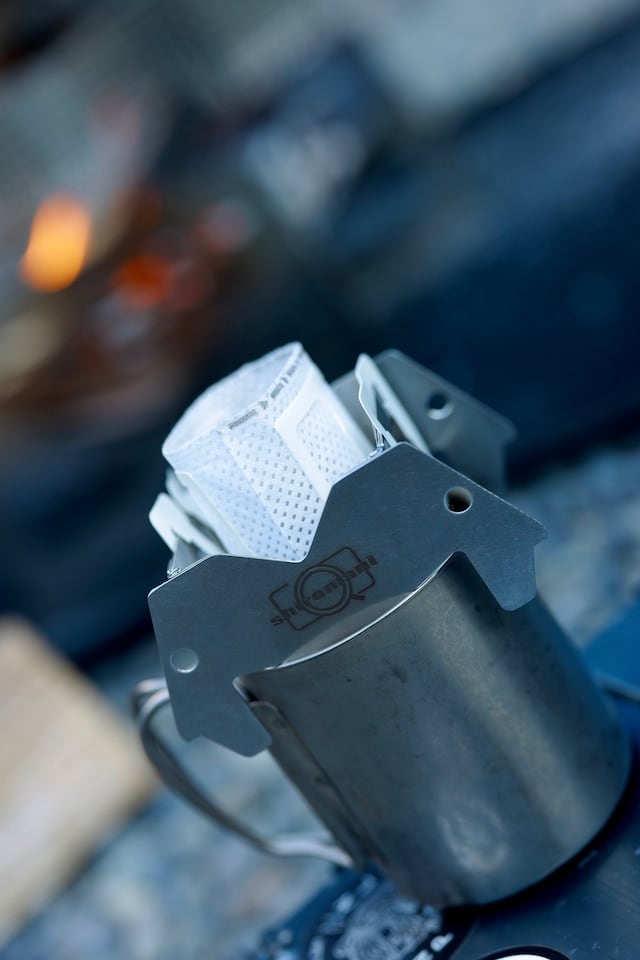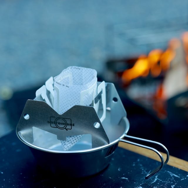 このプロダクトはshiromaniが開発したオリジナルのキャンプコーヒーギアです。ドリップバッグコーヒーの美味しさを最大限に引き出すアイテムとして生まれました。変形し一瞬で畳め、シェラカップにもセット可能。