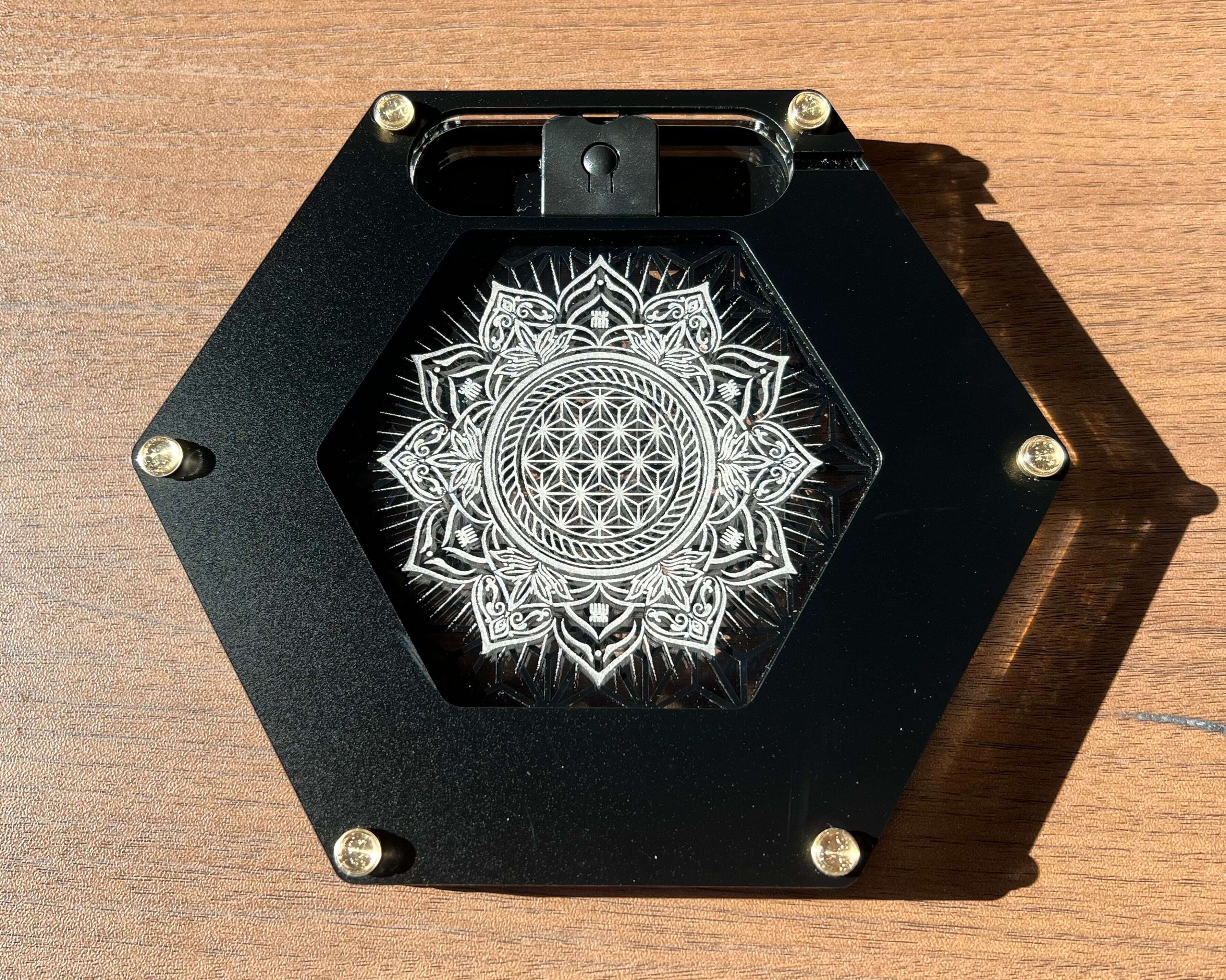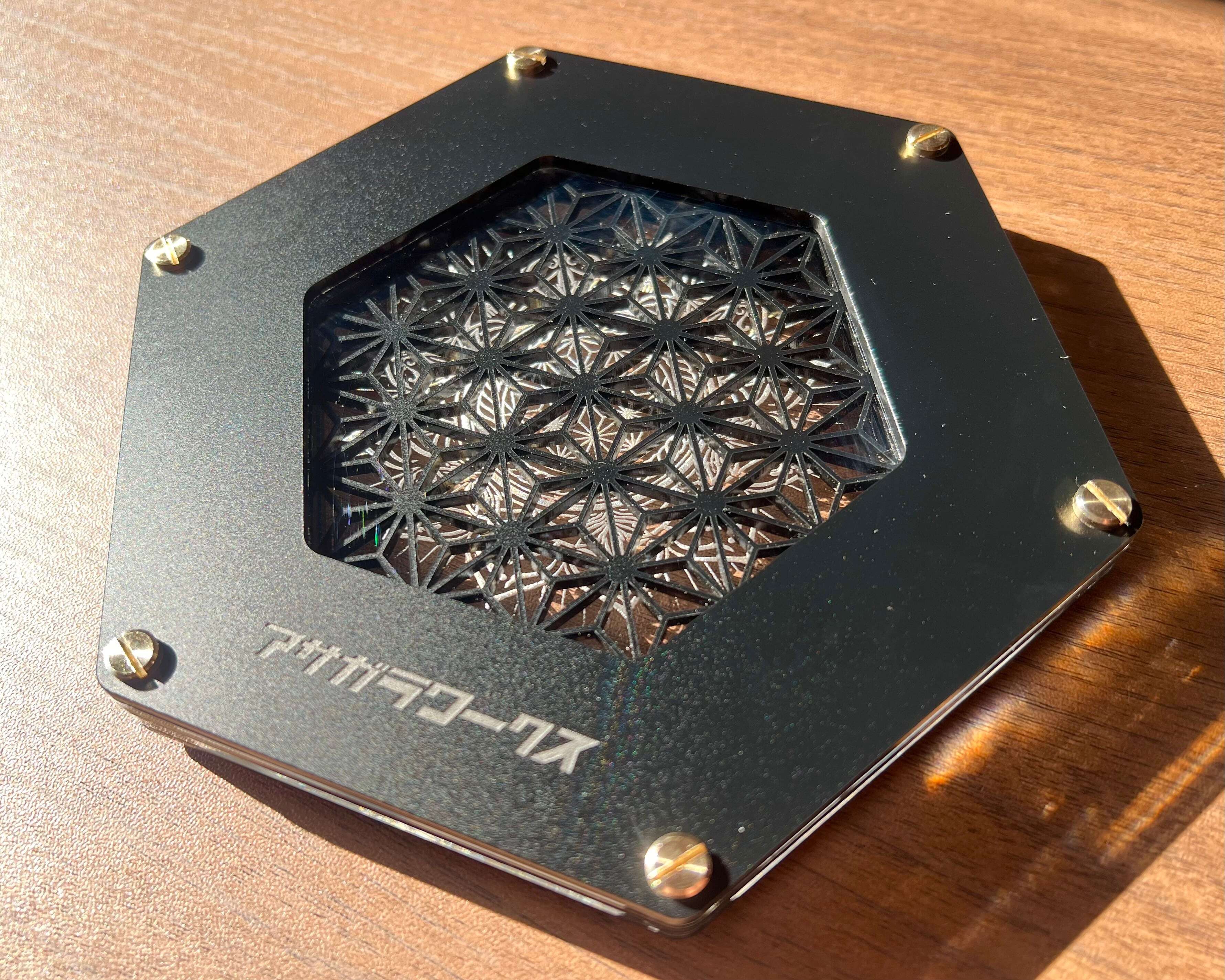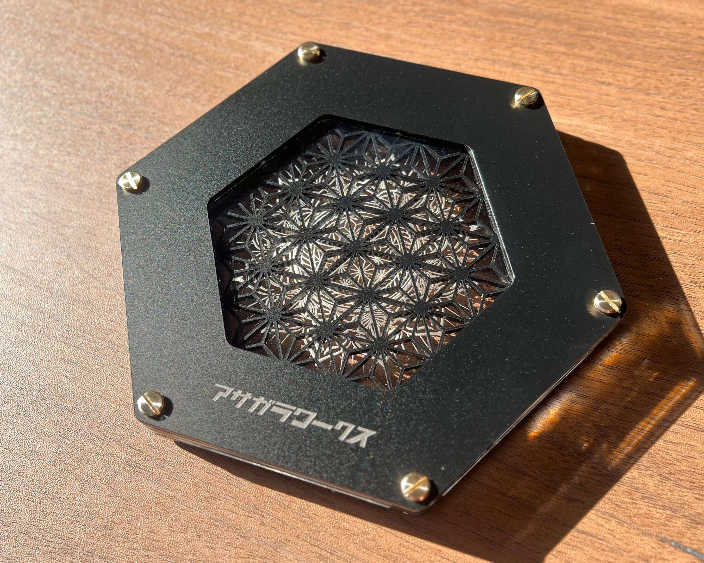 ・レーザー加工機でカットした模様は組子細工の麻の葉のパターンで平安時代に仏教の尊像の衣服にも用いられており、