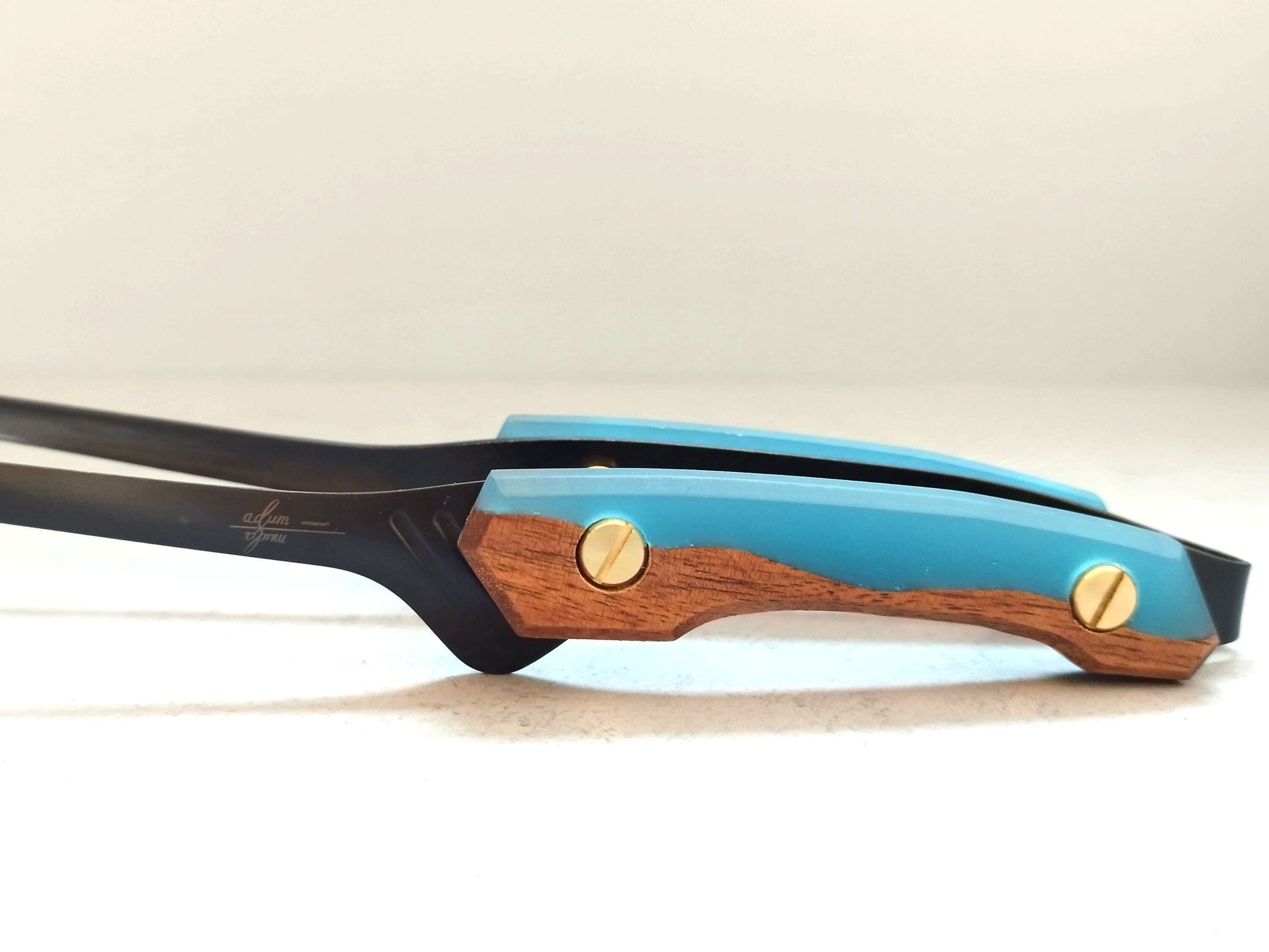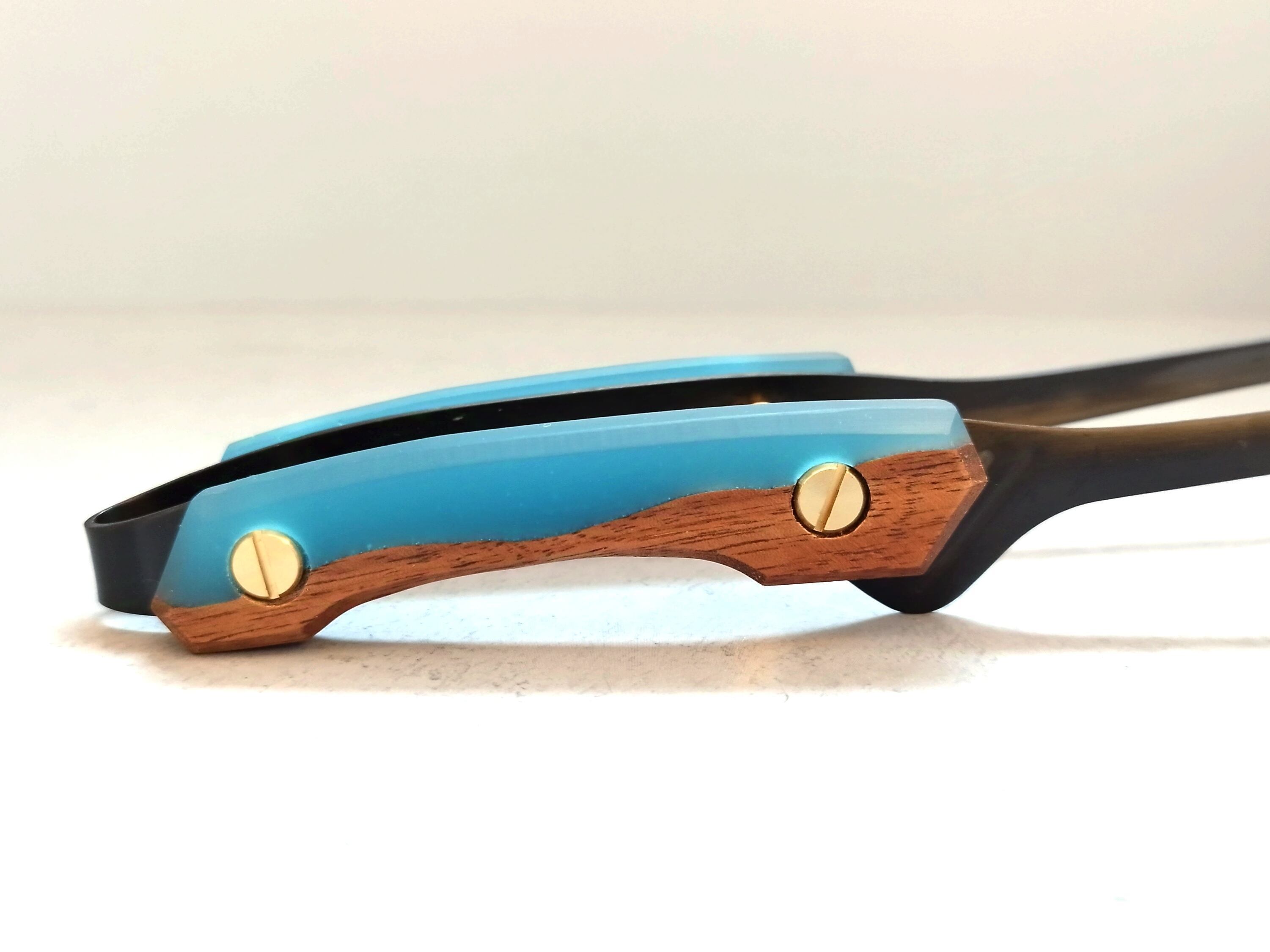 グリップの部分は、天然のブラックウォルナットの間にターコイズブルーに色付けしたエポキシ樹脂(2液性レジン)をはさみました。