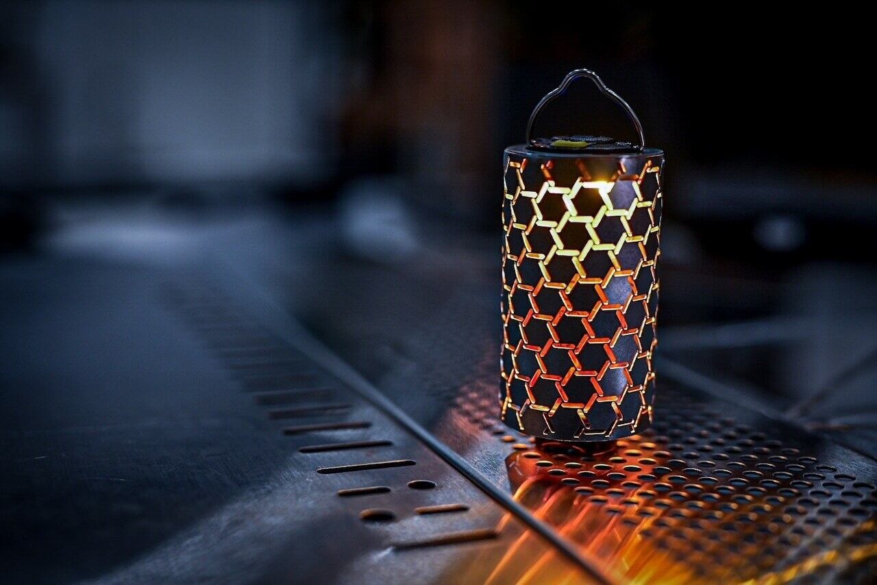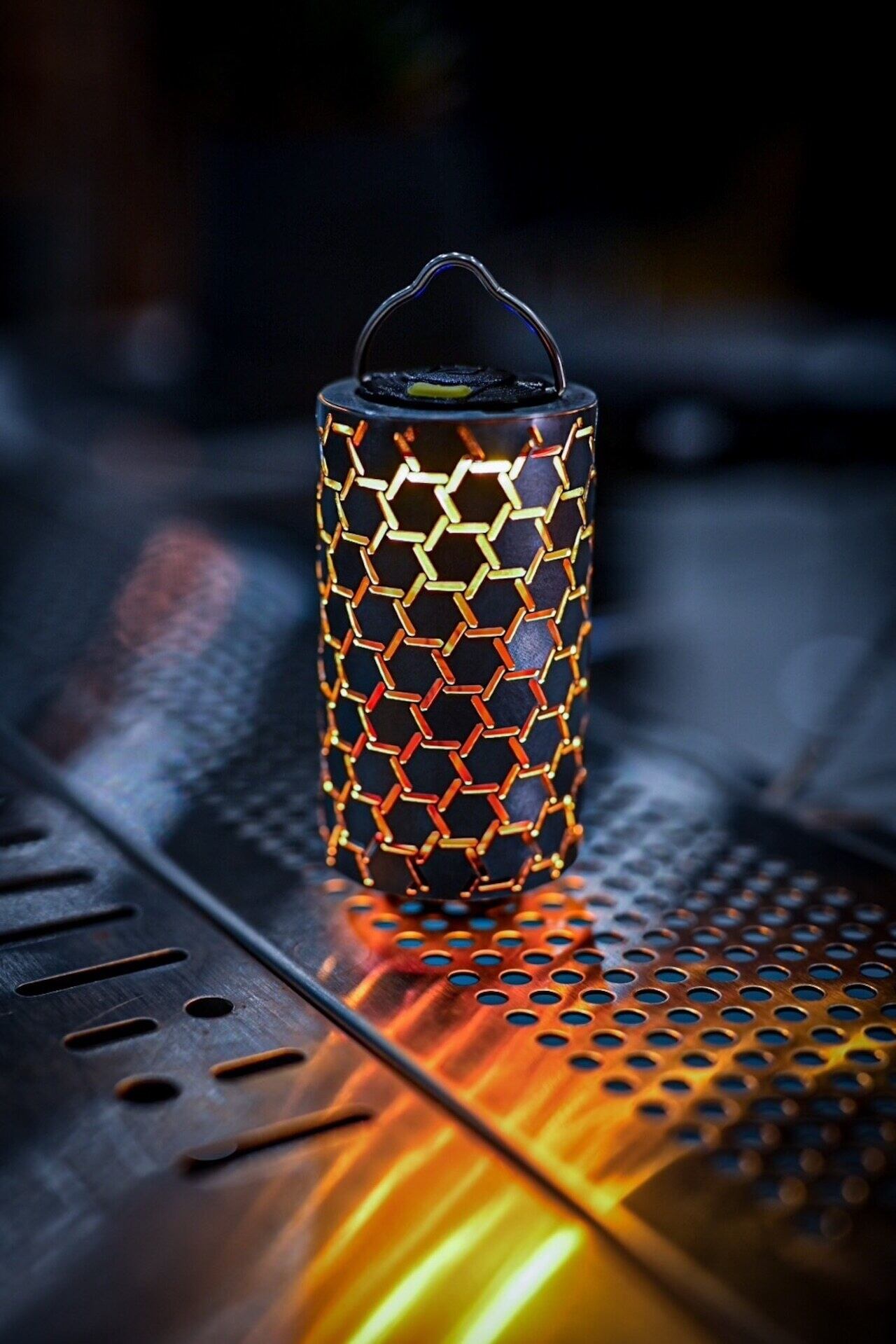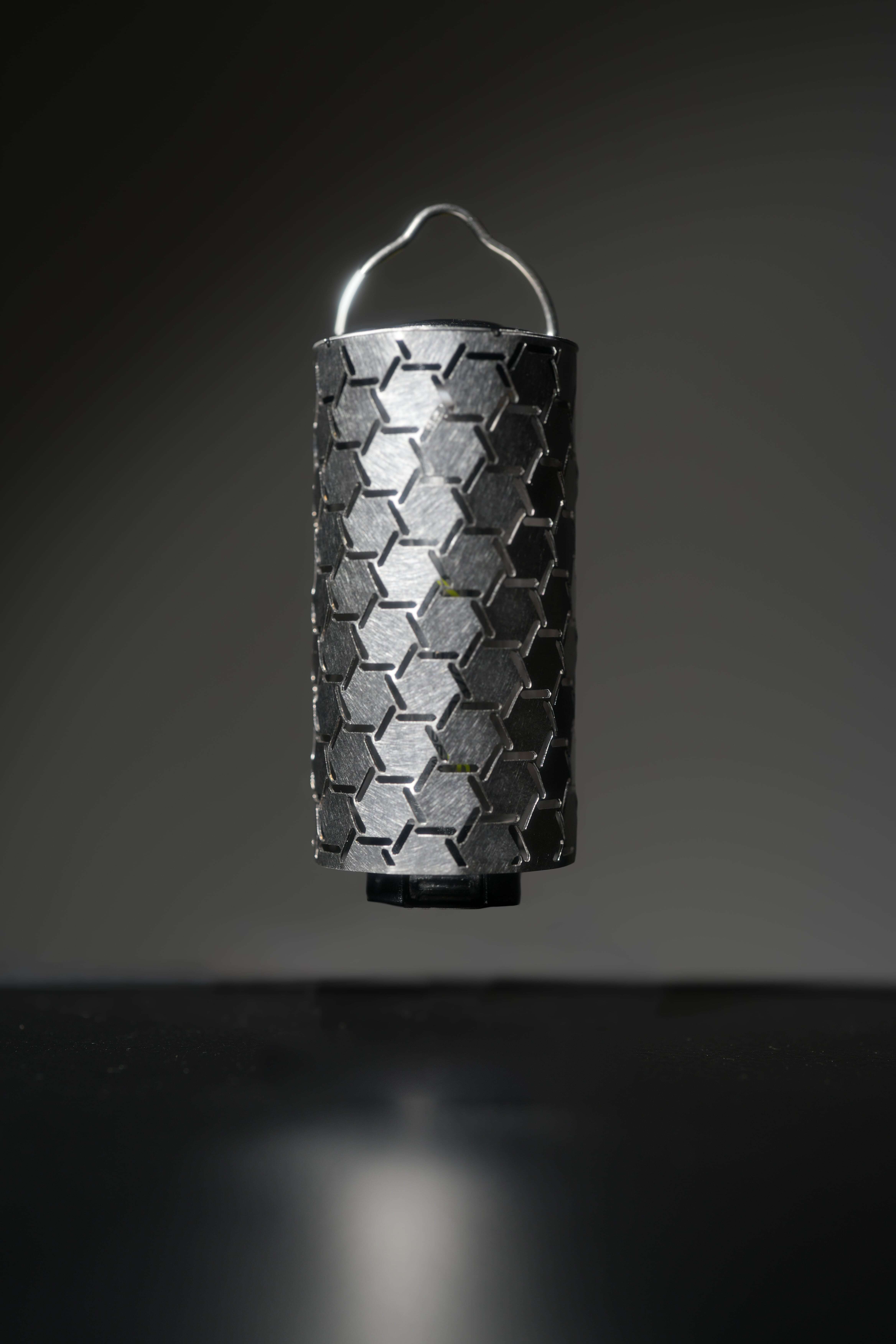 "メタルシェード"はヘキサラティスの六角形が、筒型にも関わらず独立して平面であることで、まるでプリズムのように美しく反射します。